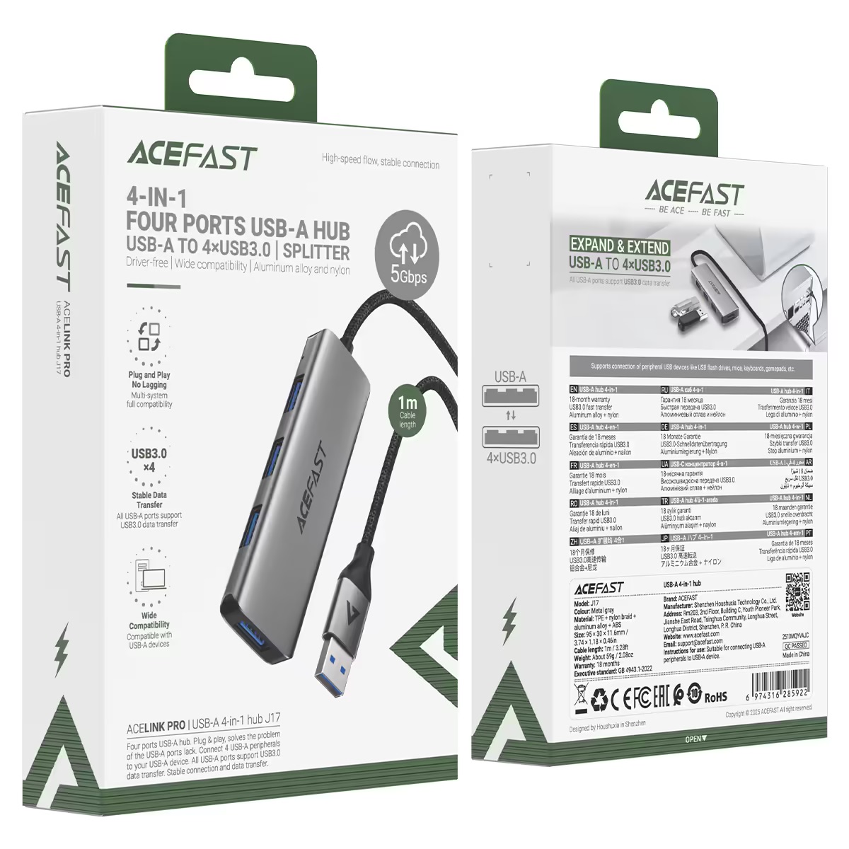 Хаб Acefast J17 4in1 USB-A Hub забезпечує просте та ефективне розширення одного USB-A порту до чотирьох USB-A портів. Оснащений 4 портами USB 3.0 зі швидкістю передачі даних до 5 Гбіт/с на кожен порт (повна сумісність з USB 2.0). Підтримує одночасне підключення кількох пристроїв: флешок, зовнішніх жорстких дисків, мишей, клавіатур, геймпадів та інших периферійних пристроїв. Plug & Play — не потребує драйверів, працює стабільно без затримок. Алюмінієвий корпус ефективно відводить тепло, а нейлонова оплетка кабелю забезпечує додатковий захист від пошкоджень. Сумісний з ноутбуками, ПК, планшетами та іншими пристроями з USB-A портом.
