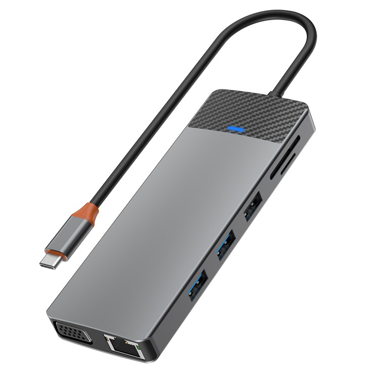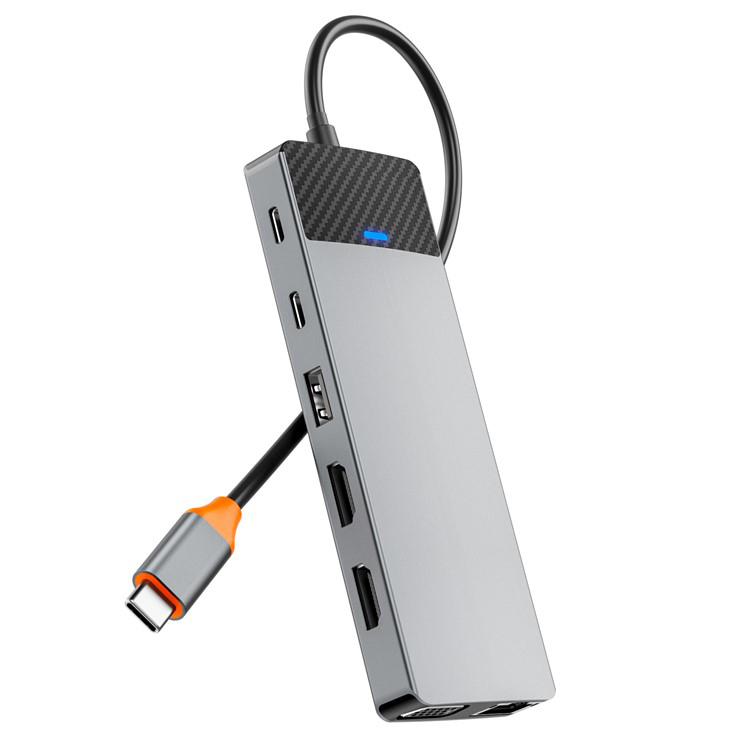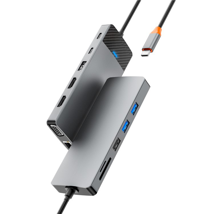• ДизайнМодель A12HV – це багатофункціональний адаптер преміум-класу, виконаний з алюмінієвого сплаву в елегантному сірому кольорі. Дизайн пристрою передбачає компактність та продуманість розташування портів, що робить його ідеальним вибором для професіоналів і мандрівників. На корпусі інтегрований індикатор, який показує статус роботи пристрою, а також вхід USB-C та різноманітні інтерфейси: 2 порти USB 2.0, 2 USB 3.0, USB-C, VGA, два HDMI, RJ45, PD та слоти для SD і MicroSD карт. Така багатофункціональність забезпечує зручність підключення великої кількості пристроїв.