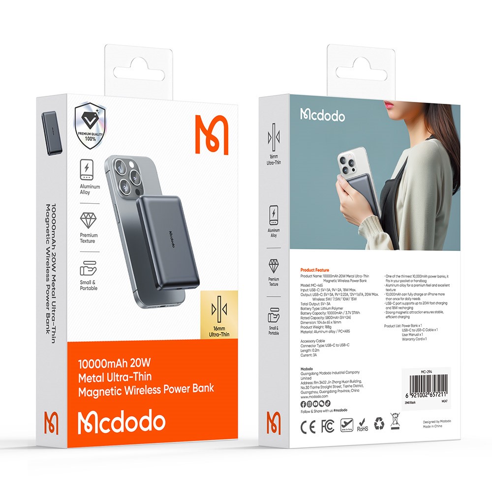PowerBank Mcdodo MC-4651 вирізняється елегантним і ультратонким дизайном, який поєднує преміальну естетику з портативністю. Корпус виготовлений із високоякісного алюмінієвого сплаву, що забезпечує міцність, стійкість до подряпин і приємну на дотик текстуру. З розмірами 104×75.1×16 мм і вагою 188 г пристрій легко поміщається в кишеню чи сумку, що робить його ідеальним для щоденного використання. Стильний металевий фініш у кольорі Dark Grey додає вишуканості, а LED-індикатор дозволяє зручно відстежувати рівень заряду. Компактна конструкція забезпечує зручність перенесення без компромісів у функціональності.