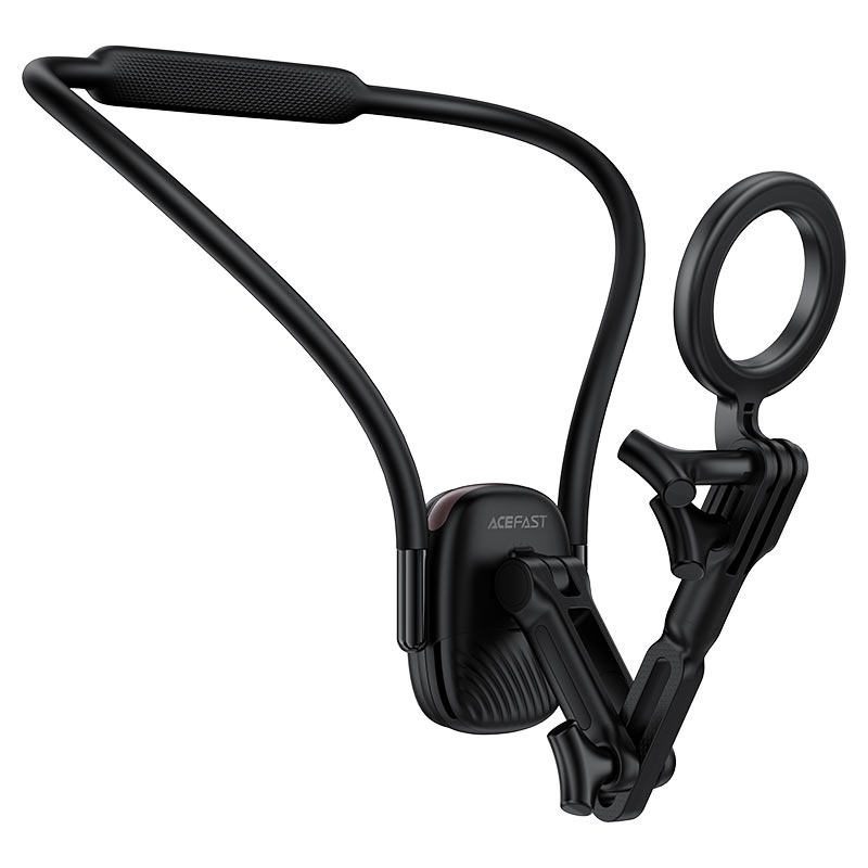 Тримач AceFast E32 виконаний у сучасному поєднанні міцного PC-пластика та м’якого силікону, що забезпечує надійну фіксацію пристрою без подряпин. Ергономічна конструкція дозволяє носити його на шиї, залишаючи руки вільними, а компактні розміри (209×256×196 мм) та вага 238 г роблять його зручним для повсякденного використання.
